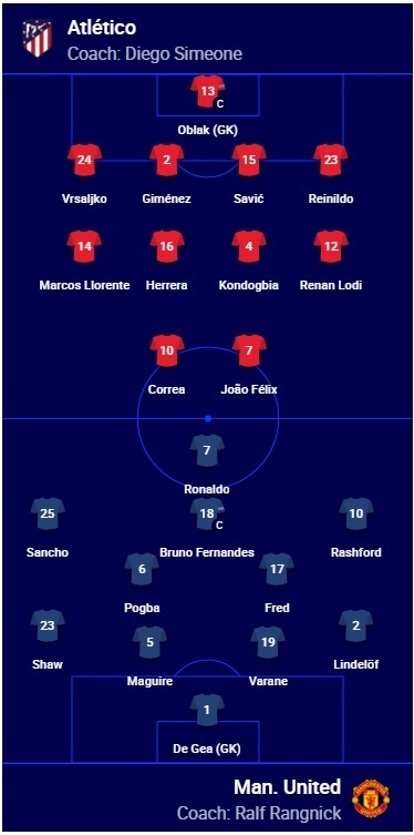Getty Images/Global Images Ukraine Сегодня, 23 февраля «Атлетико» Мадрид в первом матче 1/8 финала Лиги чемпионов дома примет «Манчестер Юнайтед». Начало матча – в 22:00 по Киеву. Стали известны стартовые составы команд на матч: «Атлетико»: Облак, Рейнилдо, Хименес, Савич, Врсалько, Маркос Льоренте, Кондогбия, Эррера, Лоди, Корреа, Жоау Фелиш «Манчестер Юнайтед»: Де Хеа, Линделеф, Магуайр, Варан, Шоу, Погба, Фред, Бруну Фернандеш, Санчо, Рэшфорд, Роналду ![]()